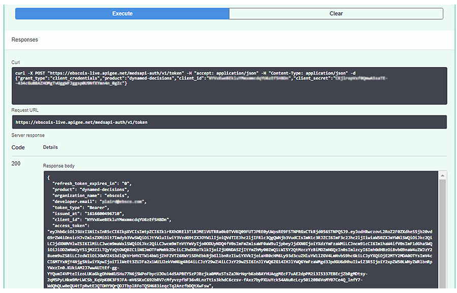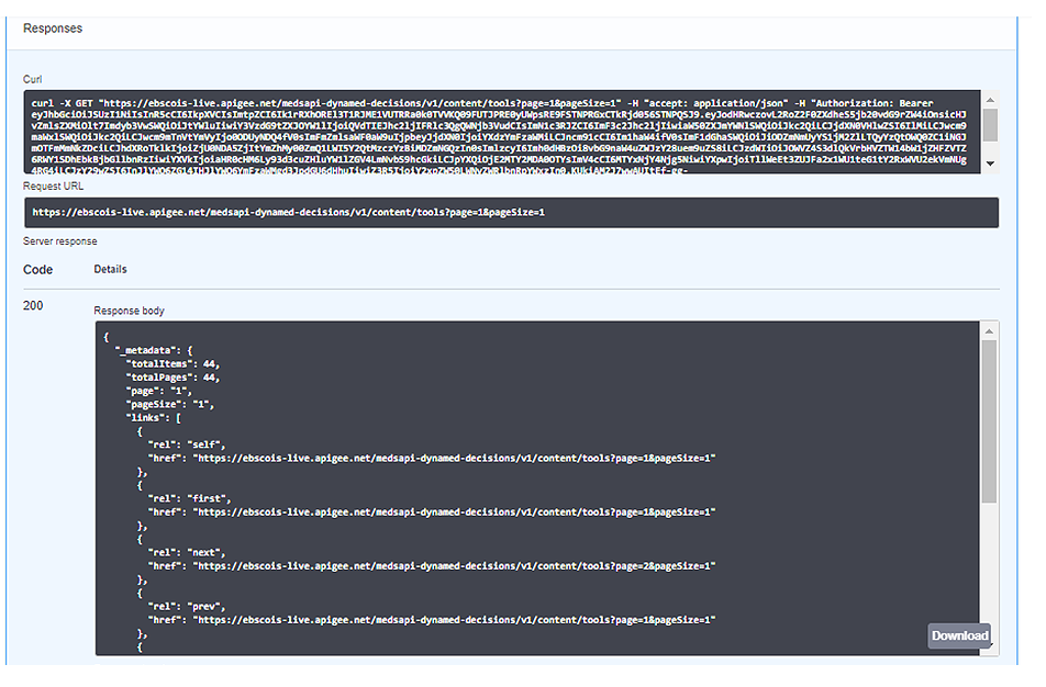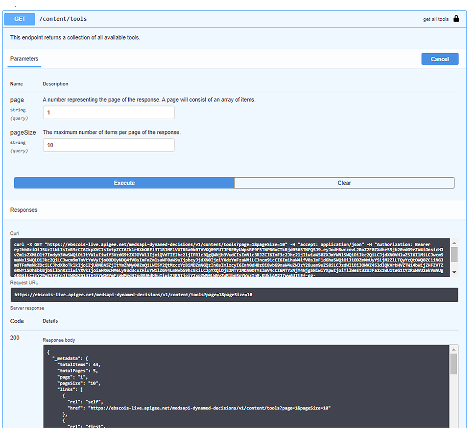- Click the Execute button. The interface makes a request to the DynaMed Decisions API with your desired parameters. The Request URL, response code, and response body for your parameters are displayed below the Execute button.