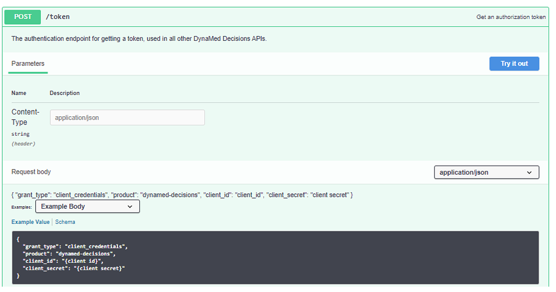 Note: You will need an authorization token from the /token resource to try any of the other resources in the MEDSAPI Dynamed Decisions API Reference.