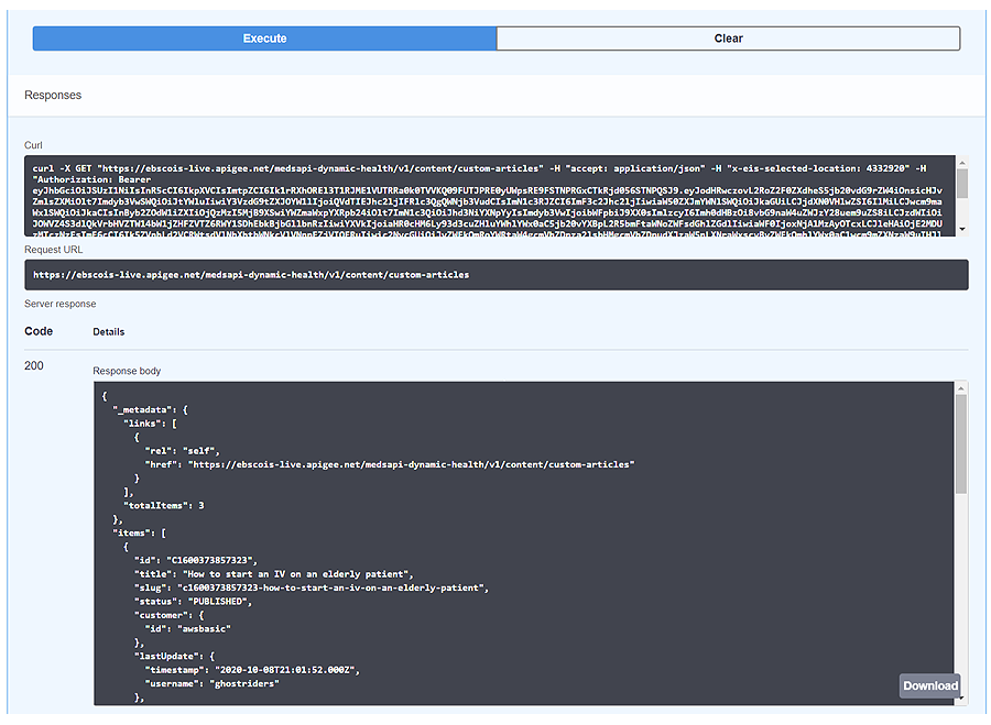 - Click the Execute button. The interface makes a request to MEDSAPI Dynamic Health with your desired parameters. The Request URL, response code, and response body for your parameters are displayed below the Execute button.