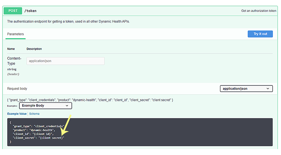 - Replace the {client id} and {client secret} in the body Example Value with your clientid and clientsecret. If you require additional body parameters in your token request, please list them in the body.